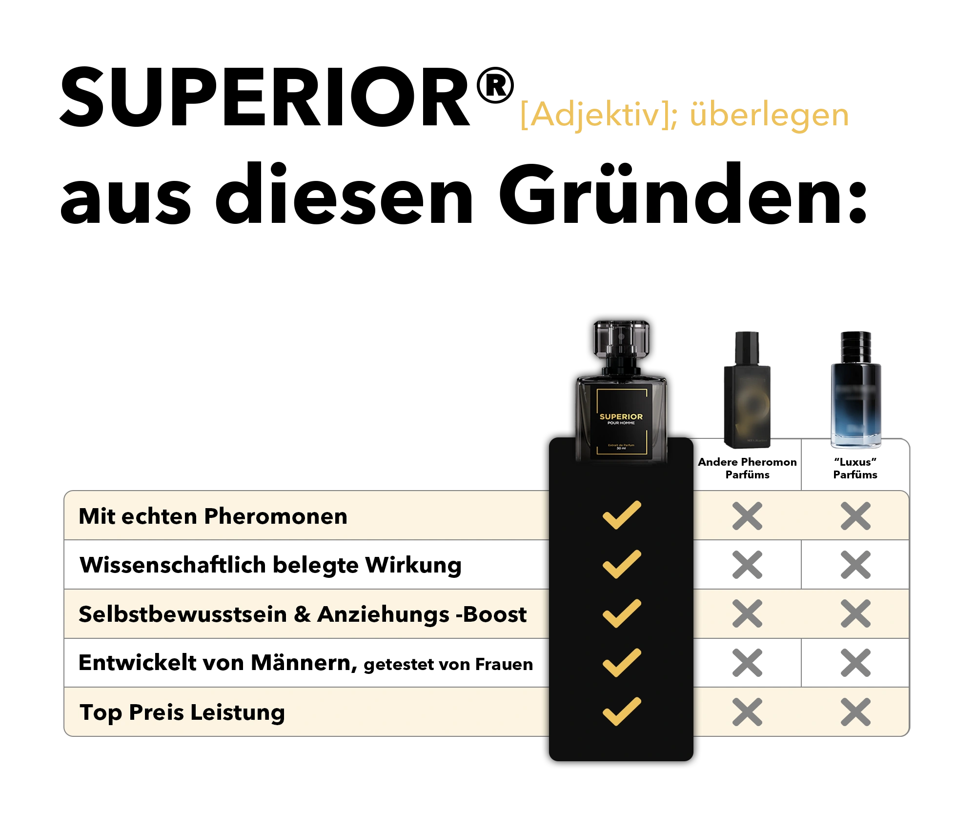 SUPERIOR® nutzt moderne Pheromonforschung, um deinen natürlichen Duft subtil zu verstärken – und dabei unbewusst die weibliche Wahrnehmung zu beeinflussen. Unsere exklusive Androstenon-Formel unterstützt dich dabei, im richtigen Moment mehr Anziehung, Präsenz und Selbstvertrauen auszustrahlen.